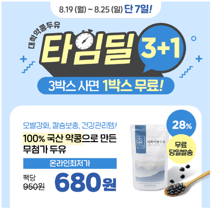 [1박스 무료] 단 7일 대학약콩두유 타임딜 OPEN! 지금 구매 시, 1박스 무료증정 & 온라인최저가 기회! 모발강화, 칼슘보충, 건강관리 베스트템 대학약콩두유는 강원도 청정지역에서 자란 약콩을 통째로 갈아 넣어 O OO OO인데요! 첨가물 없이 100% 국산약콩을 껍질째 그대로 갈아 만들어 더욱 고소하고 담백해요! OOOOO은 무엇일까요?