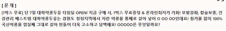 [1박스 무료] 단 7일 대학약콩두유 타임딜 OPEN! 지금 구매 시, 1박스 무료증정 & 온라인최저가 기회! 대학약콩두유는 맑고 공기 좋은 OOO OO에서 정성껏 키운 100% 국내산 약콩만을 사용했어요. 합성향료, 안정제, 유화제를 첨가하지 않은 무첨가두유로 약콩의 고소함과 영양을 그대로 느낄 수 있답니다! OOOOO는 무엇일까요?