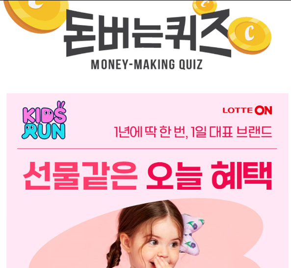 1년에 딱 한 번, 1일 키즈 대표 브랜드로 진행되는 키즈런! 오늘의 브랜드는 OOOOO 입니다. OOOOO에 들어갈 단어는 무엇일까요?