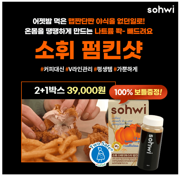 맵고 짠 음식 맘껏드세요- 나트륨 쫙 빼드려요. 어제 먹은 야식 없던일로 죄책감 갖지 말고 커피대신 가뿐한 아침을 경험하세요! 수량 소진시 조기종료 V라인 관리템 소휘 펌킨샷은 이런분께 추천해요! 매일 아침 가벼운 V라인을 원한다! 매일 앉아있거나 서있는 시간이 많다! 평소 OO과 야식이 잦다! 먹은날과 안먹은날 차이를 경험하세요. 여기서 OO은?