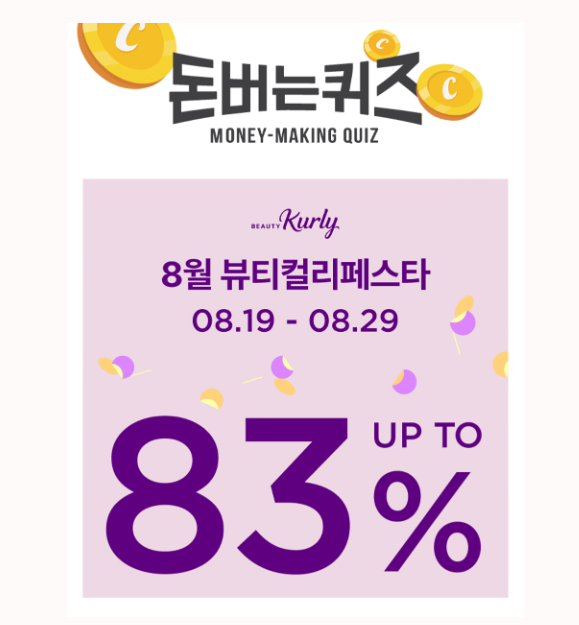 [뷰티컬리페스타, 8가지 혜택이 쏟아져요!] 누적 주문건 수 800만 기념! 지금 뷰티컬리페스타는 역대급 페스타딜 진행중! 컬리에서 최대 2만원 할인받을 수 있는 000 쿠폰을 증정해드려요! 8월 29일까지 진행하는 뷰티컬리페스타에서 부담없이 마음껏 쇼핑하세요!(힌트: ㄹㅅㄹ)