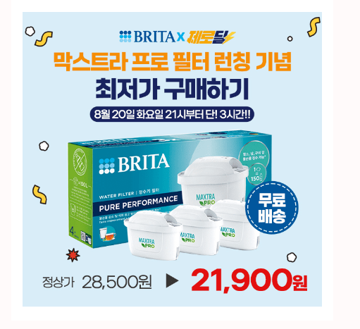 3시간동안 진행되는 "캐시딜" 타임특가에서 국민 정수기, 브리타 필터/정수기 택1이 역대급 할인 21,900원+무료배송으로 진행됩니다. 브리타 필터 1개로 OOOL를 정수할 수 있고, 간편하고 환경 친화적이며 관리비와 전기요금이 없어 더 좋다고 합니다. 빈칸에 들어갈 숫자는 무엇일까요?