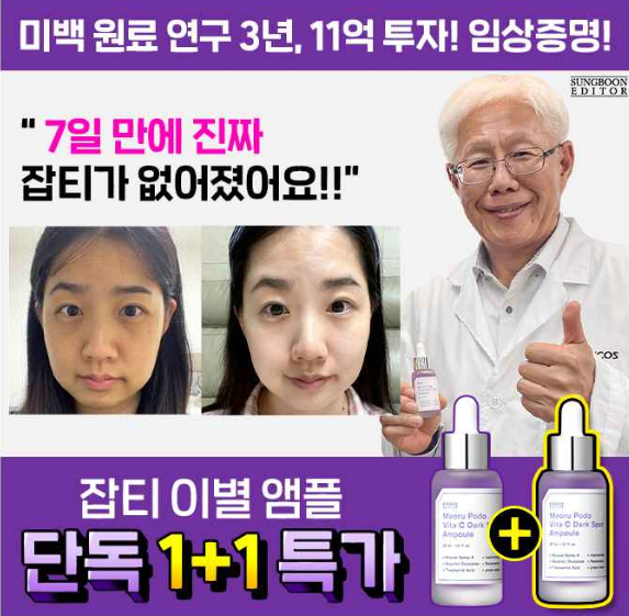 원료 연구비만 11억! 임상 증명 잡티이별앰플 1+1 단독특가 성분에디터 머루포도 비타C 잡티 앰플은 미백효과를 위해 특허받은 머루포도 비타민 유효성분이 들어있는데요, 더욱 확실한 잡티개선 효과를 위해 정제수대신 OOO를 베이스로 사용했습니다. 전체의 82%나 함유된 OOO성분은 무엇일까요?