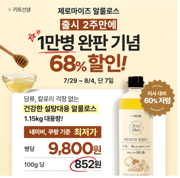 정답:[출시 2주 만에 1만병 완판] 단 7일! 제로마이즈 알룰로스 68% 할인 이벤트! 1.15kg 대용량 알룰로스가 단돈 9,800원 & 시중 최저가 100g당 852원! 제로마이즈 알룰로스는 대용량 1.15kg으로 넉넉하게 사용 가능! 설탕보다 더 맛있고 달콤한데 OOO 1.15kg 대용량 알룰로스로 더욱 경제적으로 즐겨보세요! OOO는 무엇일까요?
