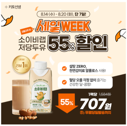 [키토선생 세일위크] 설탕 ZERO, 천연감미료 알룰로스 사용! 단 7일간 소이비랩 저당두유 55% 할인 & 팩당 707원 특가 찬스! 혈당 오를 걱정 없이 즐기는 건강한 저당두유 소이비랩! 가공없이 후기 그대로 보여드릴게요! "제가 먹어본 OOOO 중에 제일 맛있는 두유에요~ 목넘김도 깔끔하고 먹고나면 속도 편해요" OOOO는 무엇일까요?